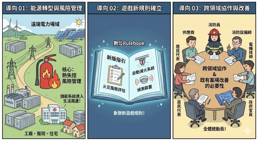 儲能系統供應商、消防設備師、建築師、物業管理與用電大戶, 都需要依據指引重新檢視設計圖說、施工細節與既有案場改善計畫。