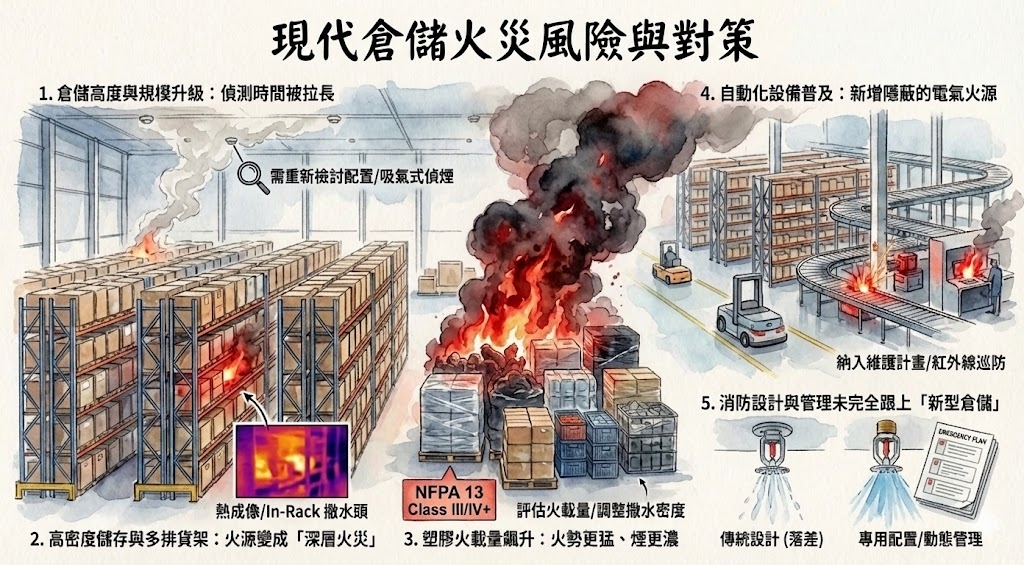 • 消防設計若仍按「一般倉庫」思維,容易出現覆蓋不足與動作延遲。