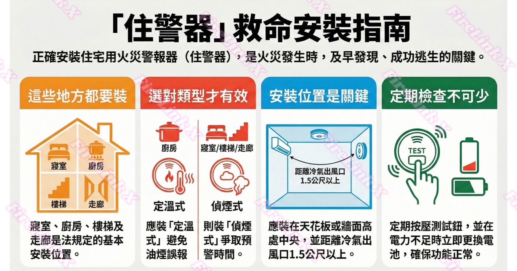 | 第6~8條 | 電源、配線、檢查與更換 | 電池達電壓下限提示即更換;外部電源需確保供電且配線不得設插座或開關並符合屋內配線規定;自動試驗功能異常即更換、不具者期限屆滿前更換,並依說明書檢查維持正常。 |