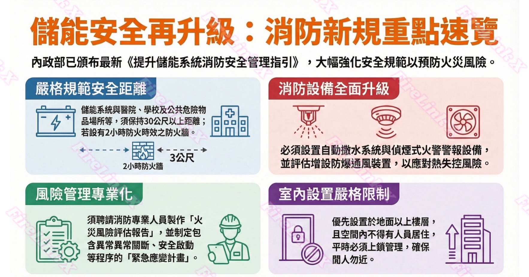以可查證資訊整理:本指引為配合淨零排放政策之能源轉型,提升儲能系統消防安全管理,以降低災害損失、確保人民生命財產安全而訂定;適用對象涵蓋併網型儲能系統與表後儲能系統,並以「每一裝置區劃空間或室外設施」之容量閾值判定適用門檻。
